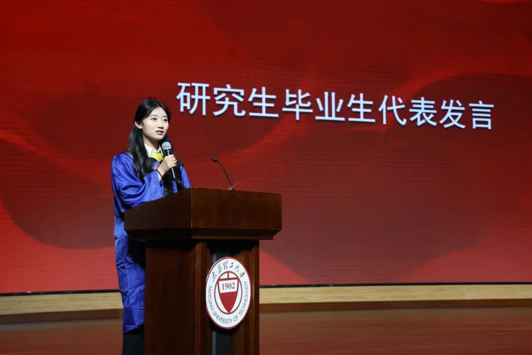 研究生毕业生代表崔佳梅同学的发言掷地有声,展现了新时代青年的使命担当。她以坚定语调回顾求学征程的艰辛拼搏,以昂扬姿态描绘未来蓝图,誓言以所学所长报效祖国,在科技强国的征程中奋勇攀登。