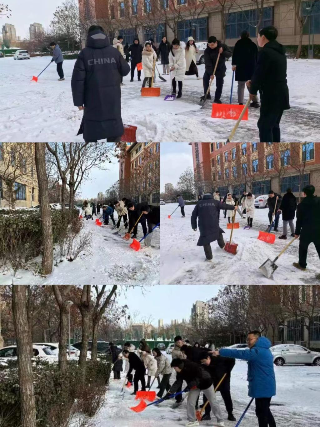清雪现场,大家不畏严寒,拿着雪铲配合默契,分工协作,毫不惜力地进行破冰、铲雪,寒风凛冽,但丝毫不影响大家的清雪热情,大家你一铲我一锹地将地面上的积雪堆到路的两边,师生共同扫雪,天冷情却暖。