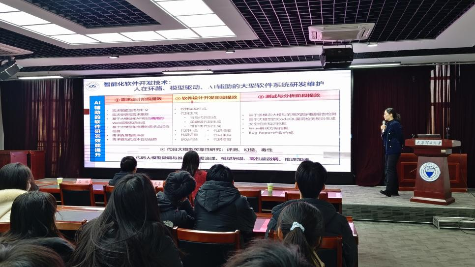石琳教授围绕“AI驱动的智能软件开发”主题,深入剖析了当前智能软件开发的现状与发展趋势,详细阐述了AI在软件开发中的辅助作用以及大模型技术对行业变革的推动作用。她着重介绍了大模型的前沿应用范式,包括领域增强、检索增强(RAG)、多模态处理、大小模型协同等技术,结合实际场景分享了AI驱动的代码生成、代码续写、代码解释及研发问答等实践案例,为现场师生带来了前沿技术的深度解析与丰富示例。