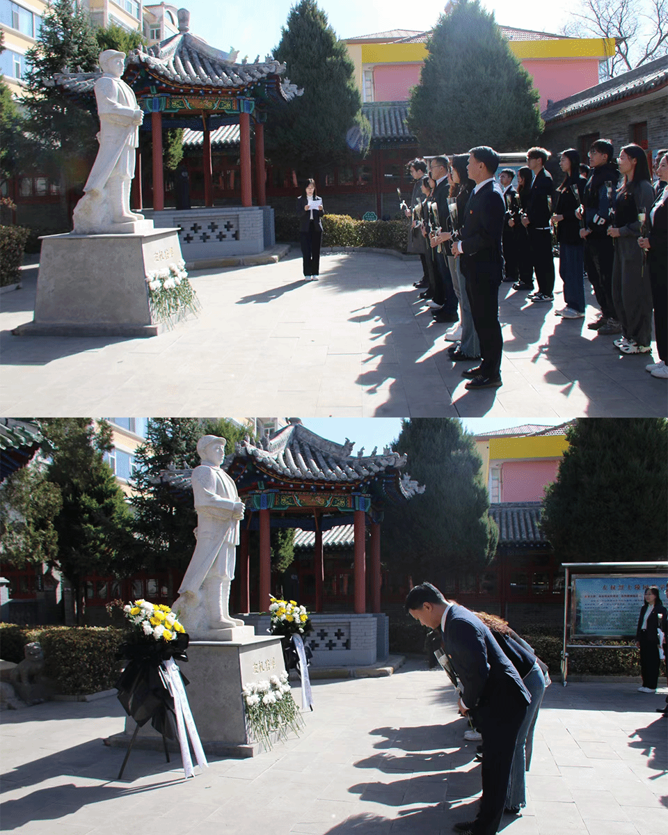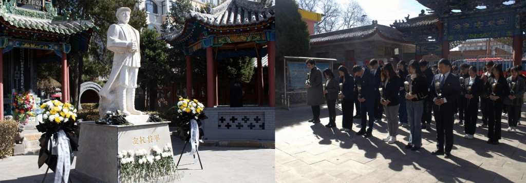烈士陵园内树木苍翠,纪念碑巍峨耸立。全体党员、团员代表整齐列队,肃立在烈士纪念碑前,向为国家和人民英勇献身的左权将军以及所有革命烈士默哀,心中充满着对先烈的敬仰与缅怀。默哀毕,全体师生将鲜花有序敬献于纪念碑前,每一束鲜花都寄托着对革命烈士的无限哀思和崇高敬意。