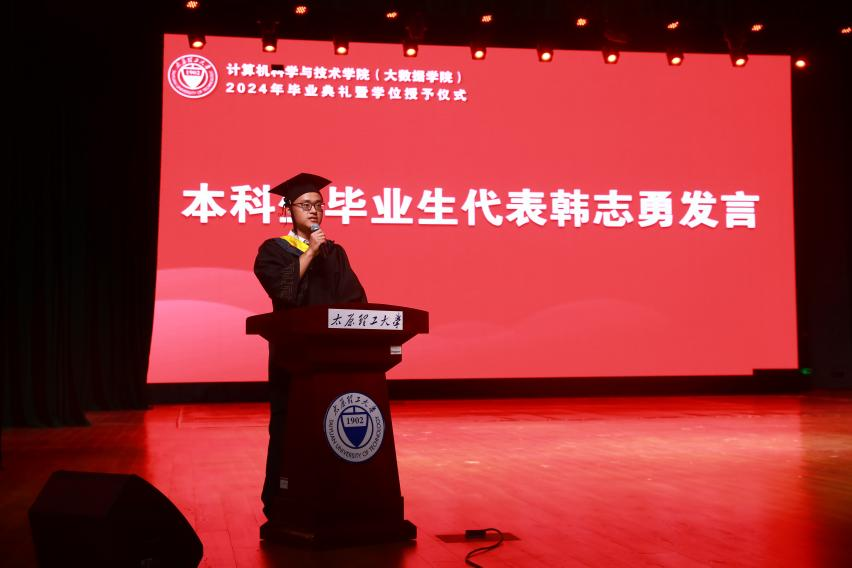 本科毕业生代表韩志勇在毕业典礼上表达了对母校的不舍和感激,分享了大学四年的收获与感悟,表示未来无论身处何地,都会永葆家国情怀、牢记使命担当,在研究生阶段继续深耕医疗科研,用人工智能技术为生命健康事业贡献力量,以青春的名义在奋斗道路上步履不停