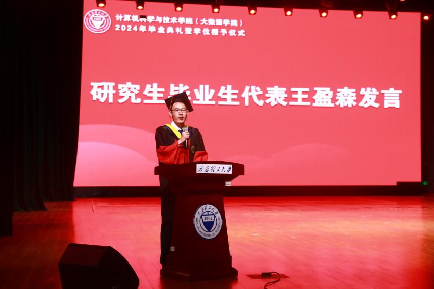 九载寒窗苦读书,不忘初心志毅坚,博士研究生代表王盈森通过一点一滴、一幕一景回顾了他在太理本硕博九年的宝贵瞬间,不舍师长的课堂,难忘同窗的同行,一路成长奋斗的自己,他表示校园的美好、公司的温暖将是大家心中最美好的回忆,愿同学们不负老师们的殷切期望和深情嘱托,用一生去诠释“求实 创新”的校训,以实际行动回馈母校,肩负起时代赋予的重任,扬己之长攻坚攻关,心怀家国砥砺前行。