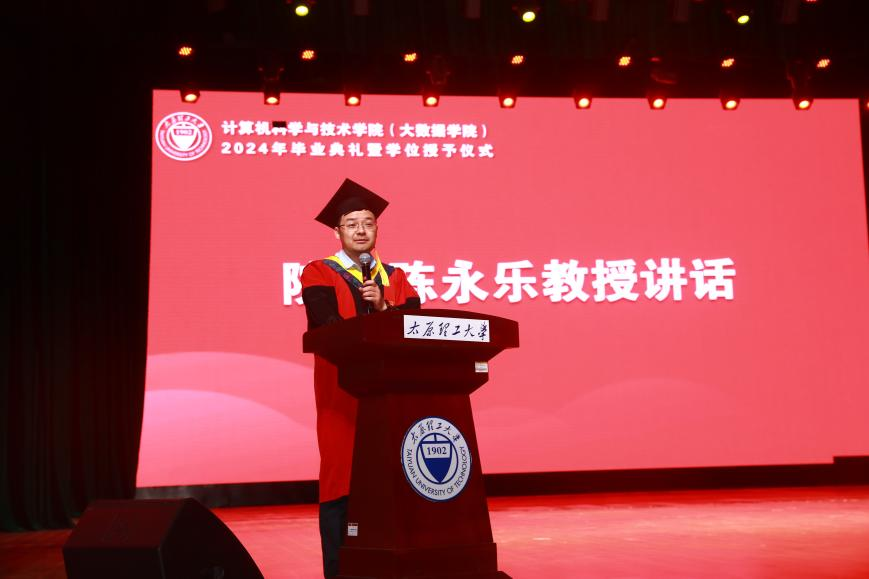 陈永乐代表公司向顺利完成学业的同学们表示热烈祝贺,向辛勤培育的父母和老师致以衷心的感谢,并作题为《风好正是扬帆时,奋楫逐浪向未来》的讲话。在讲话中,他以“相信时代、相信时间、相信自己”为关键词,殷切嘱托即将步入社会、踏入人生下一阶段的计算机(大数据)学子,在科技创新日新月异,数字经济蓬勃发展,人工智能、大数据、云计算等新兴技术方兴未艾的新时代,要充分发挥公司特色和优势、跃入时代浪潮,要相信时代、乘势而进,相信时间、不懈奋斗,相信自己、阔步前行,向下扎根、向阳生长。争做新时代的奋斗者,在逆境中成长、在挫折中前进,积极应对变化与挑战,以务实严谨的科学思维、实事求是的科学态度为国家发展贡献青春力量,在时代洪流间,竞显英雄本色,用青春谱写未来。